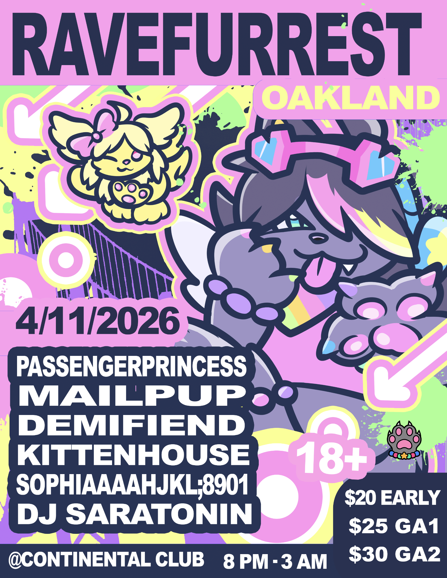 RaveFurrest hits Oakland with a neon-soaked night built for the furry rave scene. Expect fursuits, high-energy dance music, bass-heavy sets, and a welcoming crowd celebrating creativity, costumes, and community on the dancefloor.
